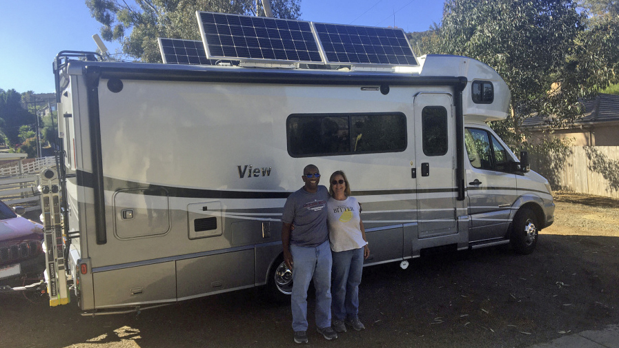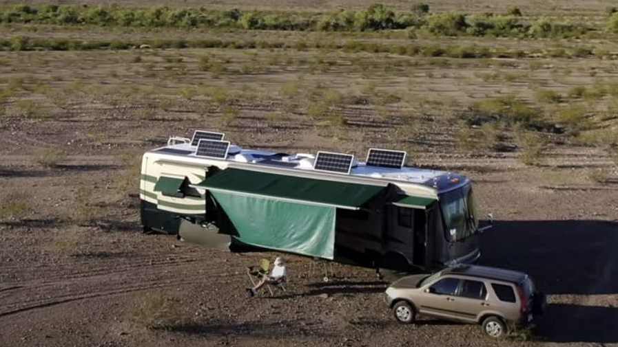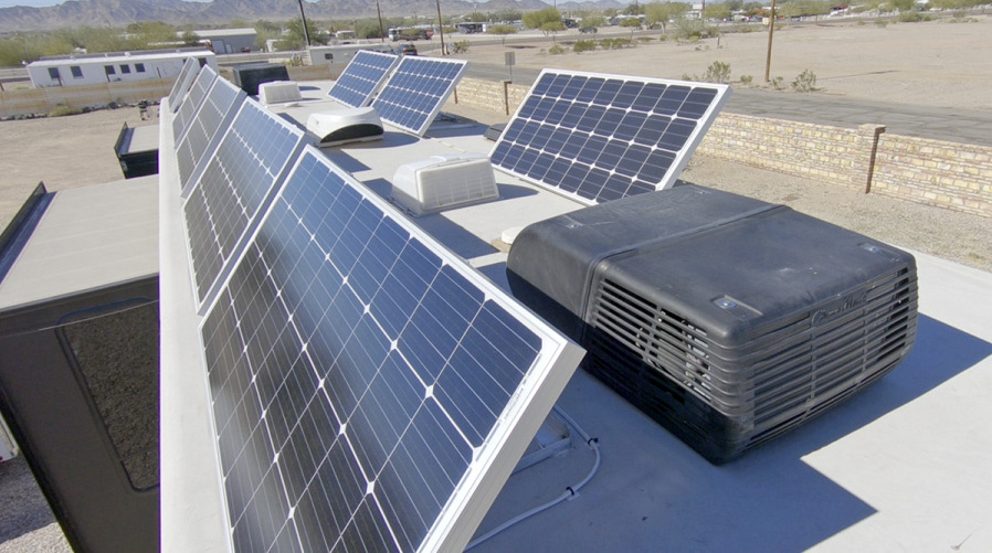Tony & Terry, set up to boondock, with six lithium batteries and four SolaRVector II systems